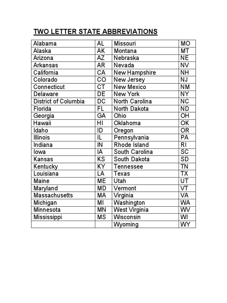 List Of All 50 Us State Abbreviations